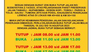Hal itu sebagaimana edaran atau pengumuman yang disampaikan langsung PPK 2.3 Provinsi Sulawesi Tengah Kepala Satker PJN Wilayah II Provinsi Sulawesi Tengah, dengan surat izin buka tutup jalan nomor; B/206/VII/YAN.2.14/2023 atas pelaksanaan paket preservasi Jalan Tawaeli-Napubomba-Kebun Kopi-Toboli-Parigi & Tolai-Sausu-Tumora (Bts Kab. Poso), khususnya pekerjaan lereng atas di lokasi KM 49+450 & 50+150.