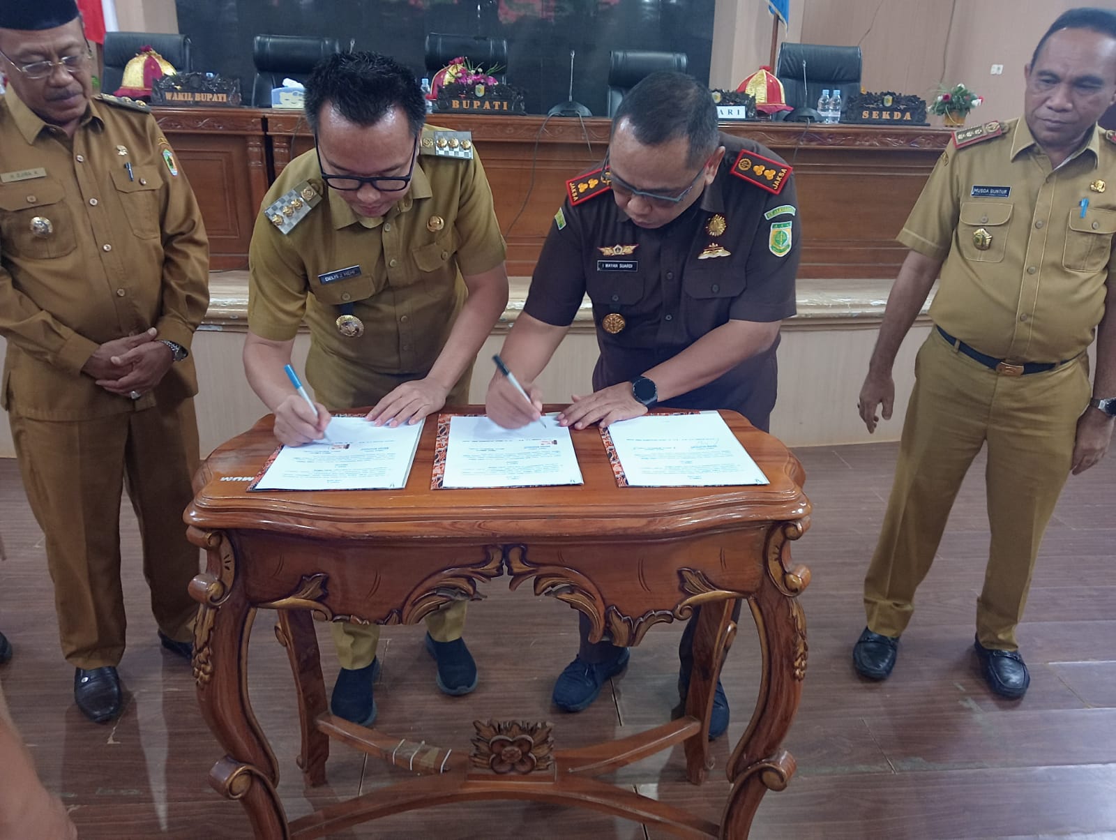 FAJAR BANGGAI, MORUT – Bupati Morowali Utara (Morut), Dr. dr. Delis Julkarson Hehi, MARS, menjalin kerjasama dengan Kejaksaan Negeri Morowali tentang pelaksanaan bantuan hukum, pertimbangan hukum dan tindakan hukum lainnya, di Ruang Pola Kantor Bupati, Selasa (08/08/2023). Hal itu dalam pengawasan roda pemerintahan di daerah itu.