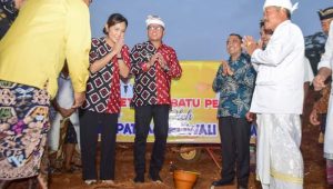 FAJAR BANGGAI, MORUT – Staf Ahli Gubernur Sulawesi Tengah Bidang Ekonomi dan Pembangunan Dr. Farid Rifai, S.Sos, M.Si, meletakkan batu pertama sebagai tanda dimulainya pembangunan Pura Agung Jagatnatha Kabupaten Morowali Utara, Senin sore.